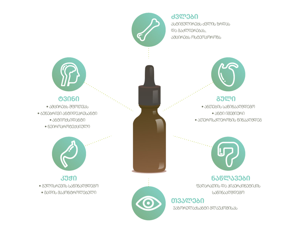 სერტიფიცირებული, გასუფთავებული ზეთები, კანაბიდიოლის სხვადასხვა კონცენტრაციით და მრავალფეროვანი შემადგენლობით